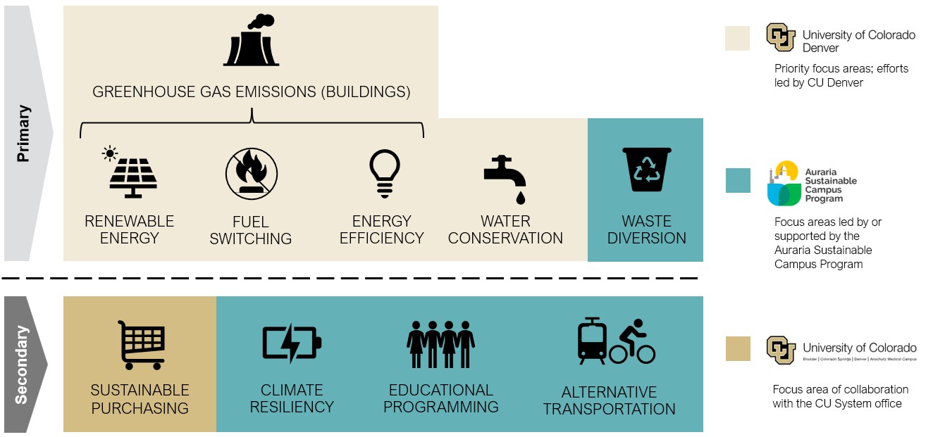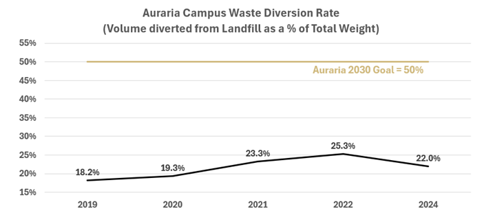 Waste (particularly food waste) contributes to methane emissions, which are a potent greenhouse gas. Landfilled waste can also make its way into our oceans and waterways, leach contaminants into groundwater, and cause environmental health impacts. This goal is aligned with the Auraria Sustainable Campus program, our campus partner for waste diversion. The State of Colorado has established a goal of diverting 39% of waste from landfills by 2026 and 45% by 2036.