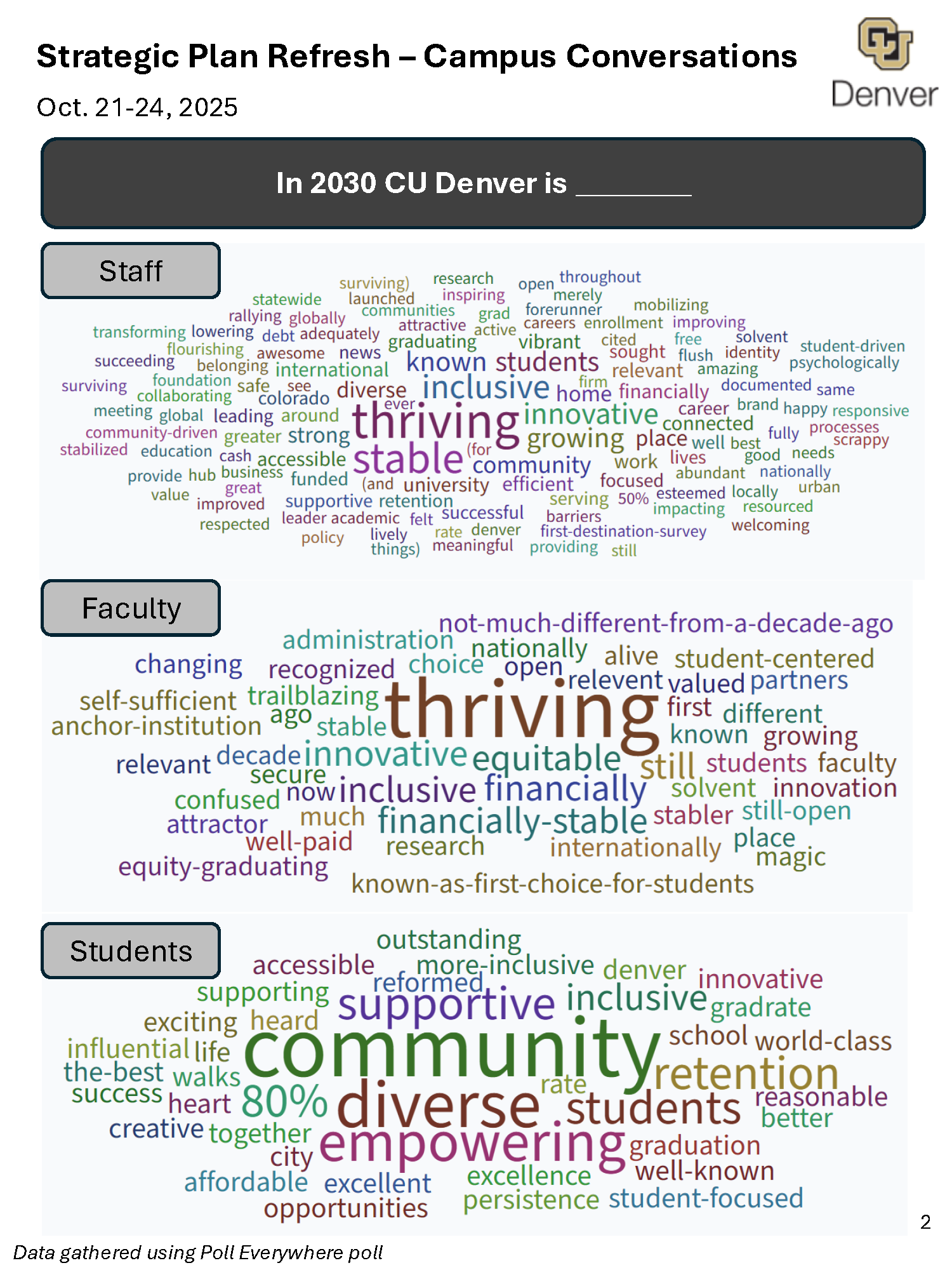 This fall, in addition to campus conversations for faculty and staff, strategic dialogues have been taking place across CU Denver units. They are meant to tease out: